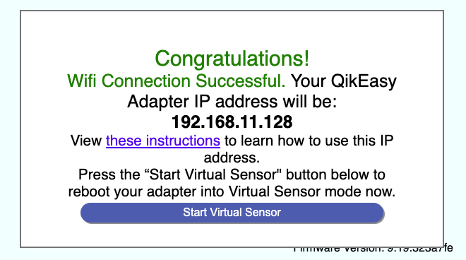 As above, at the end of the initial Virtual Sensor setup process, our web user interface will display the virtual sensor’s IP address.