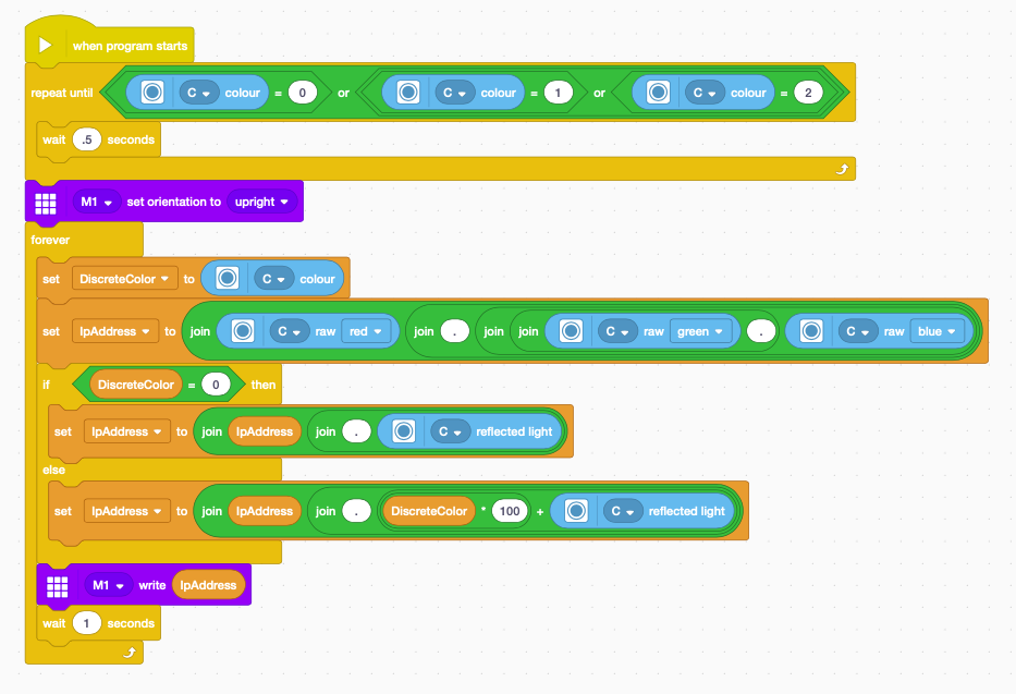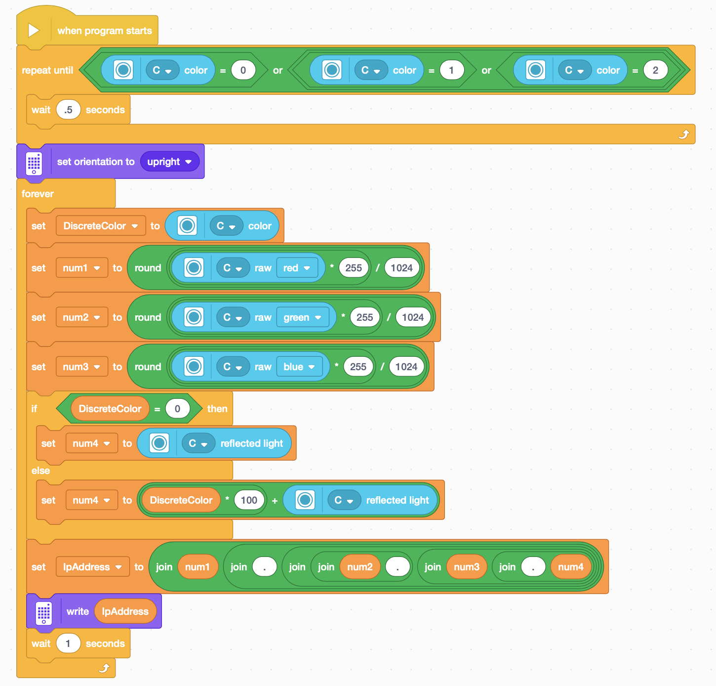 Every time upon bootup of the Virtual Wireless Sensor, the device will start in virtual Color Sensor mode, and will preset its measurements based on the IP address. It is possible to use a Word Block program to read these measurements and display the IP address on your Spike Prime hub.