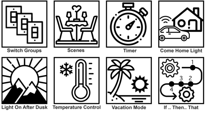 If.. Then.. That. Flexible programming allows switch states, time, temperature and other events to invoke a sequence of actions.