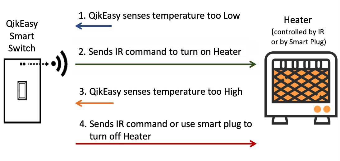 Temperature Control uses QikEasy switch’s built-in temperature sensor to trigger an appliance (e.g. heater) to turn on or off through either the switch, or infrared remote controller.